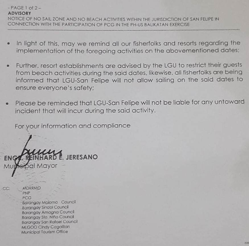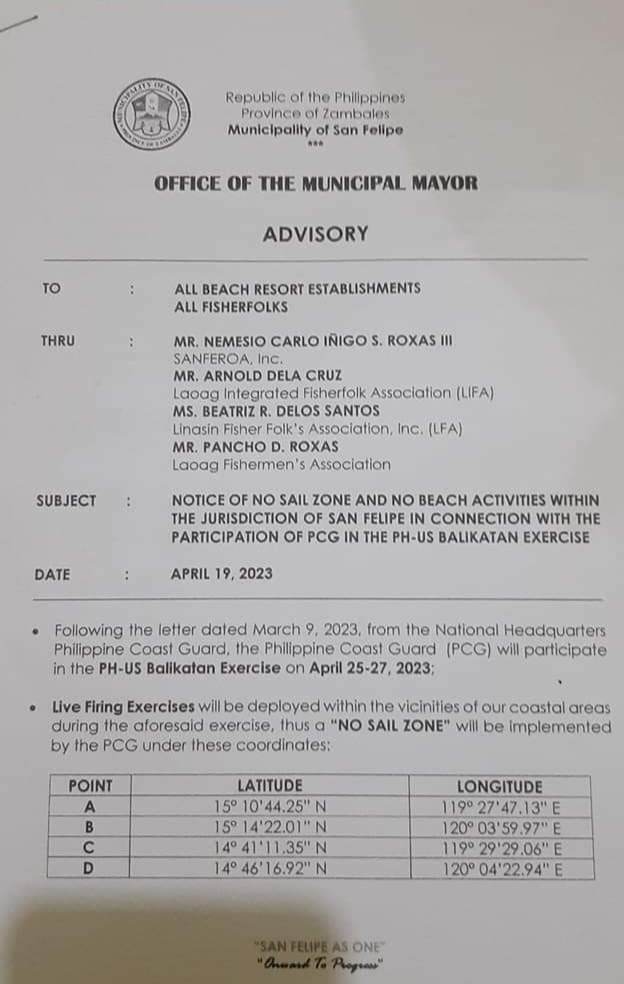 Maging sa San Felipe ay nagpalabas din ng advisory si Mayor Reinhard Jeresano noong Abril 19 para sa mga mangingisda at beach resort establishment owners ng No sail zone at no beach activities sa kanyang munisipalidad habang ginaganap ang naturang military exercise.