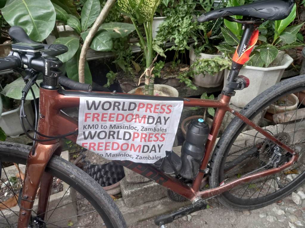 World Press Freedom Day campaigner Richard Reyes (kneeling, 3rd from left of photo), a photojournalist of the Philippine Daily Inquirer pose for a souvenir picture with Zambales Mama’s Biker Zone Team during a revitalization stop of the 200-kilometer epic Manila to Masinloc bicycle ride on April 30, Sunday, in Castillejos-town Zambales province.