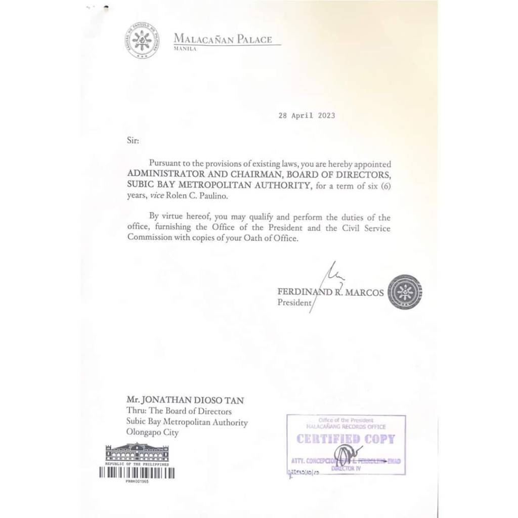 Nanumpa kay Executive Secretary Lucas Bersamin ang bagong Itinalagang si Jonathan Dioso Tan bilang bagong Chairman at Administrator ng Subic Bay Metropolitan Authority (SBMA) matapos na ilabas ng Malacañang ang appointment nito noong nakaraang Abril 28, 2023.