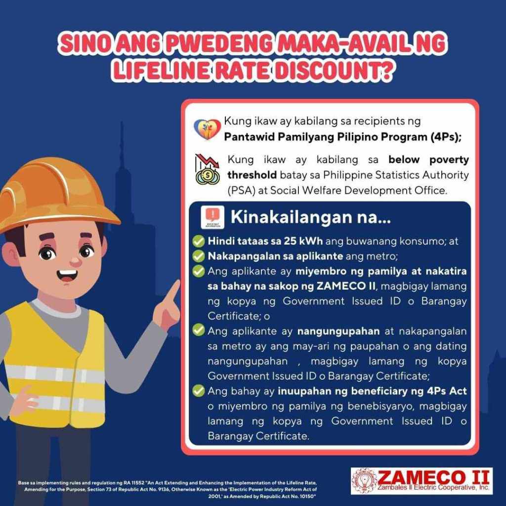 Ang Lifeline Rate Discount ay subsidiyang ibinibigay sa mga Marginalized End User ng kuryente na hindi humihigit sa 25 kWh ang buwanang konsumo, sang-ayon sa itinatadhana ng IRR ng RA 11552.