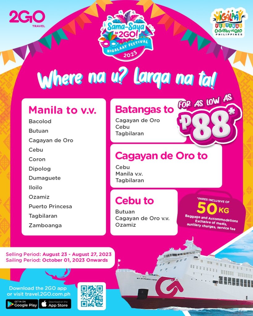 To celebrate with the city as it welcomes its Higalaay Festival week, 2GO announces the ₱88 sea sale, one way inclusive of 50 kilo baggage allowance. The promo is running until August 27 with travel from October 1, 2023, onwards. Book tickets today and experience your ultimate sailcation to Manila, Bacolod, Cebu, Iloilo, Tagbilaran and many more.