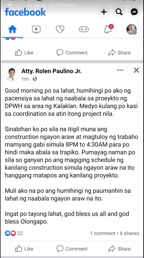 “Humihingi po ako ng pacensiya sa lahat ng naabala sa proyekto ng DPWH sa area ng Kalaklan. Medyo kulang po kasi sa coordination sa atin itong project nila,” saad sa mensahe ni Paulino sa kanyang social media page.