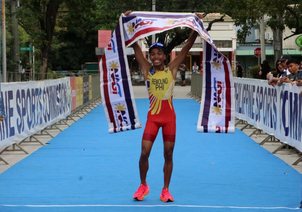 Andrew Kim Remolino clocked 56 minutes and 56 seconds to claim victory in the men’s division of the 750m swim-20km bike-5km run competition.