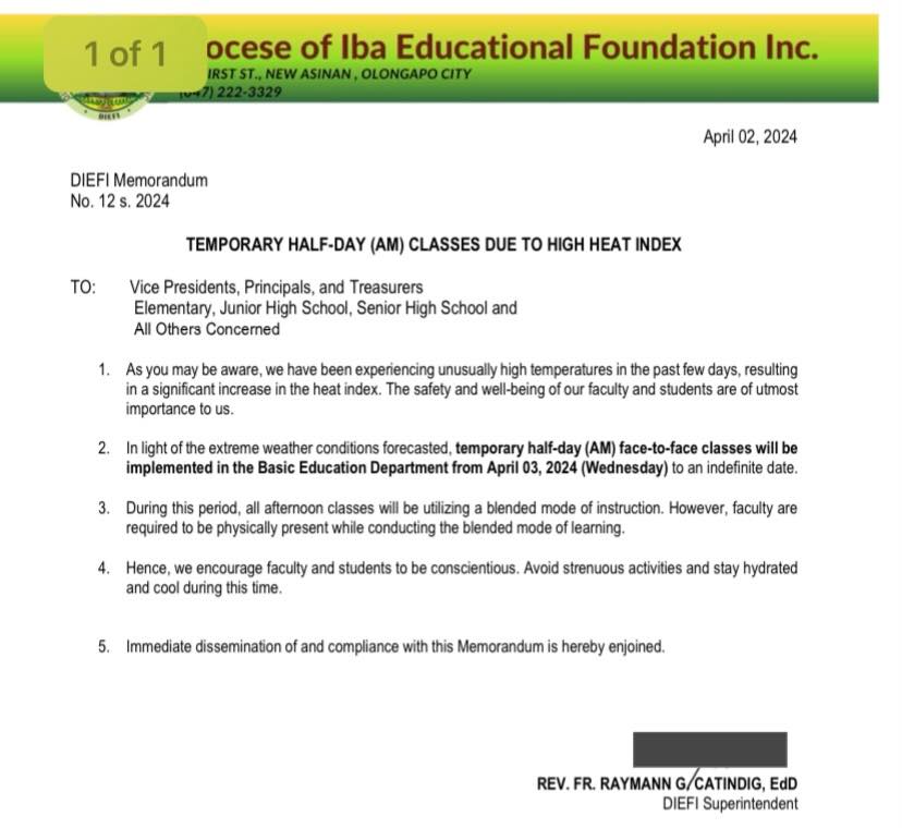 Catindig, who is also the Superintendent of the Diocese of Iba Educational Foundation Inc., which runs the Columban College here to do the same as stated in DIEFI Memorandum No. 12 s. 2024.
