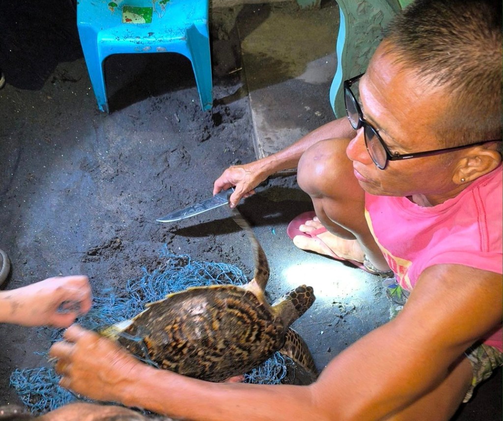 Isang Hawksbill sea turtle ang nailigtas ng mga miyembro ng Sagip Pawikan ng Sitio Fuerte matapos itong matagpuan nakukulumpulan ng lambat sa dalampasigan ng Bonito 2 Resort, Barangay Poblacion, Morong, Bataan.