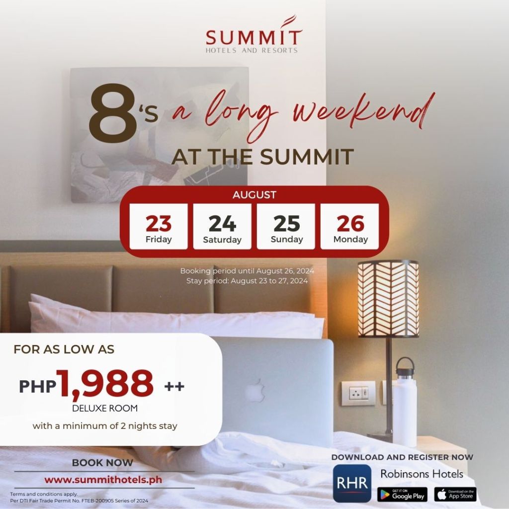Robinsons Hotels & Resorts (RHR) is thrilled to announce an exclusive offer for the upcoming long weekend. Guests and Travelers can take advantage of unbeatable rates across all RHR properties: Grand Summit, Summit Hotels, GO hotels and GO Hotels Plus, making the long weekend the perfect opportunity to have a staycation, a quick getaway or vacation with your loved ones.