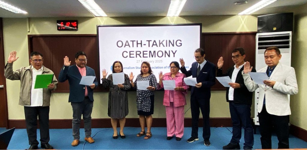 The newly elected Board of Trustees and executive officers of the Journalism Studies Association of the Philippines (JSAP), the national association of journalism educators, take their oath of office before Undersecretary Joe Torres, executive director of the Presidential Task Force on Media Security (PTFoMS), at the Philippine Information Agency Building in Quezon City on Thursday, Feb. 27, 2025.