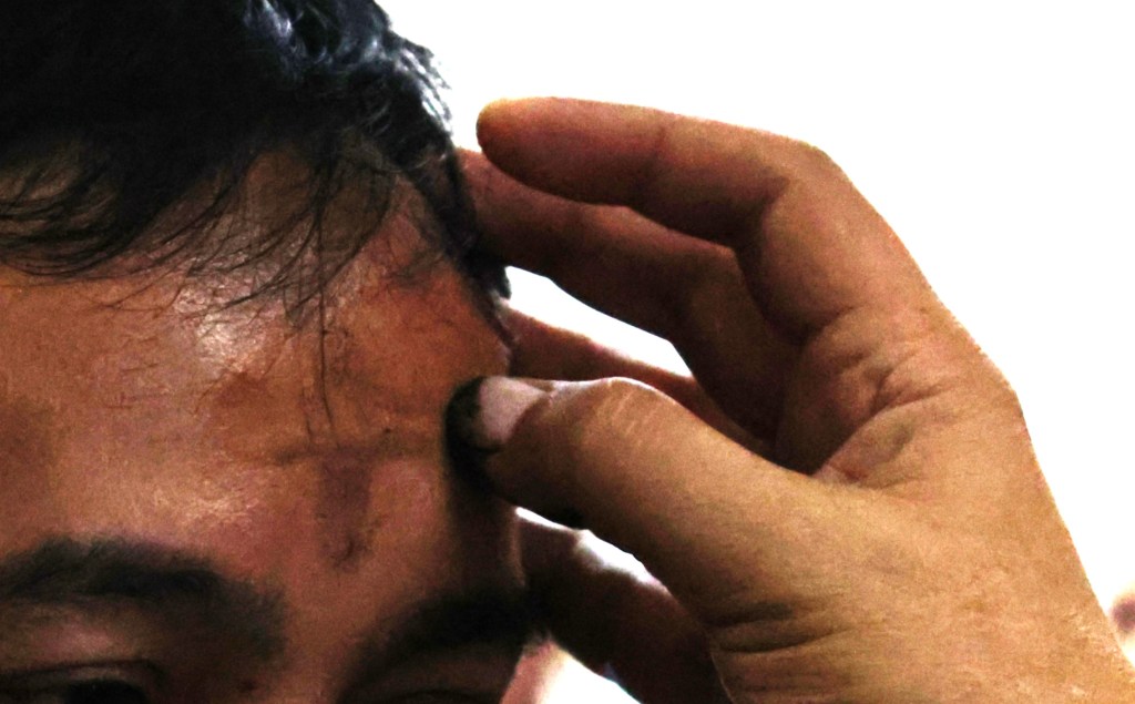 A Roman Catholic devotee receive the symbol of the cross on his forehead on Ash Wednesday as a solemn reminder of the beginning of penitential Lenten season in Christian faith. Photo was taken at the hallway of Building 255 in Subic Bay Freeport zone. (Ang Pahayagan photo / JUN DUMAGUING)