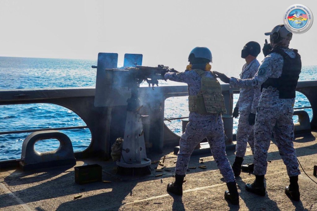 📸Philippine Navy personnel aboard BRP Ramon Alcaraz (PS16) operate a .50 caliber gun during a surface target shoot as part of the Gunnery Exercise of MME at San Felipe, Zambales on April 25. (AFP)