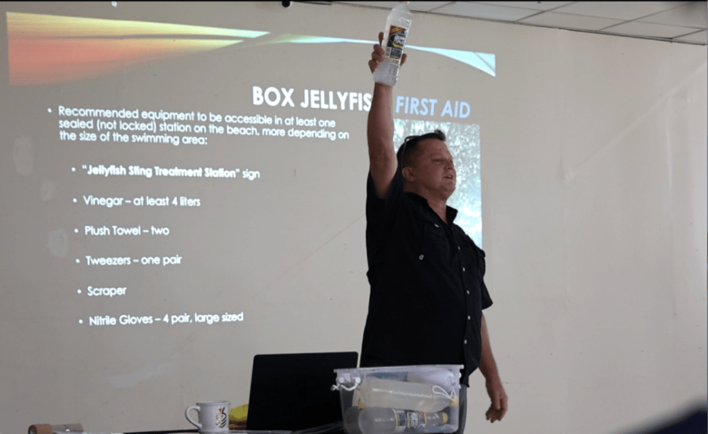 United States Navy retired Chief Petty Officer Michael Walls recommends using household vinegar as a first aid treatment for box jellyfish stings as he addresses participants of the Subic Bay Metropolitan Authority (SBMA) Public Health and Safety Group’s Box Jellyfish Awareness and Treatment Seminar held at the Subic Bay Exhibition and Convention Center in Subic Bay Freeport.