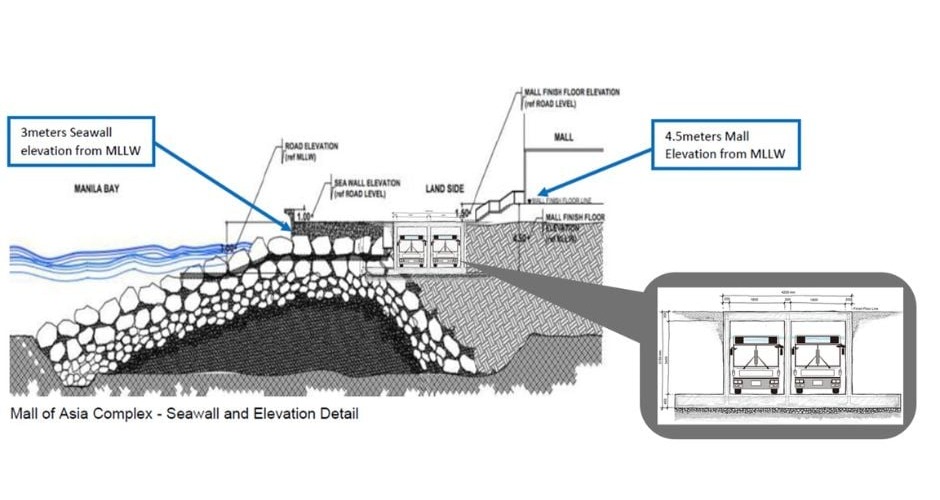 The SM Mall of Asia Complex features a higher seawall and elevated design to guard against rising sea levels. (Inset) Deep, wide drainage channels—large enough to fit two buses side by side—further protect the area from storm surge flooding.