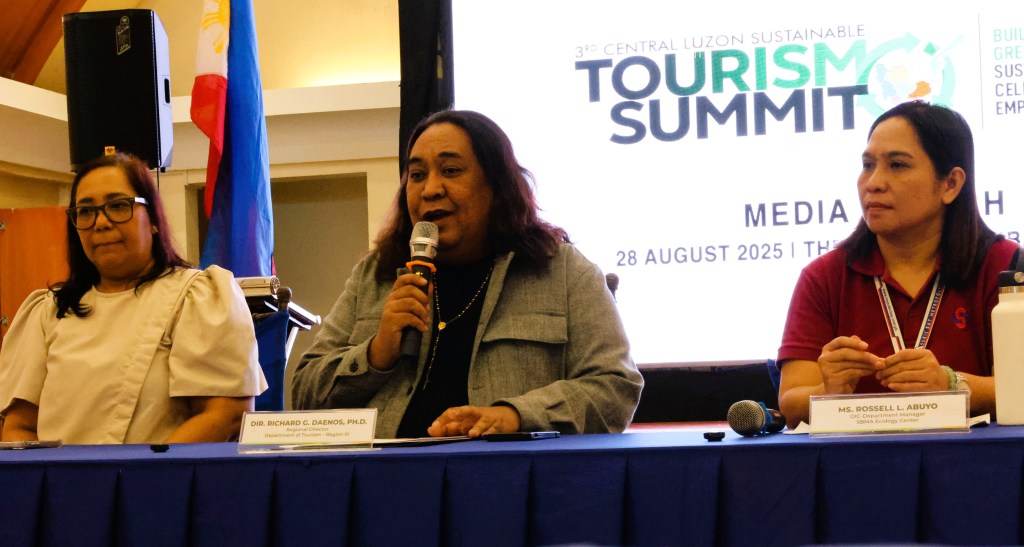 📸 Department of Tourism Region 3 Director Richard C. Daenos (center) joins Rossell L Abuyo, head of the SBMA Ecology Center and Mary Jamelle A. Camba, Manager of the SBMA Tourism Department, answer queries from media practitioners during the media launch for the upcoming 2025 Sustainable Tourism Summit slated on September 10-12, 2025 at the Subic Bay Exhibition and Convention Center. (SBMA HO via Ang Pahayagan)
