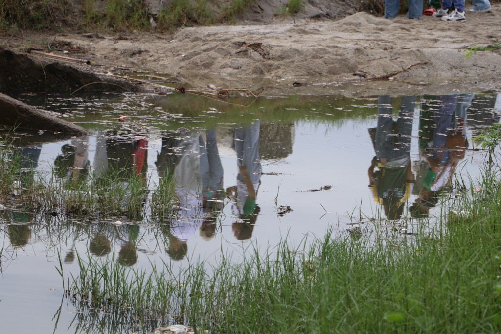 Volunteers are reflected on a puddle of water as they do their part on beach clean-up in Subic Bay Freeport on Saturday, September 20, 2025. (Ang Pahayagan photo / JUN DUMAGUING)