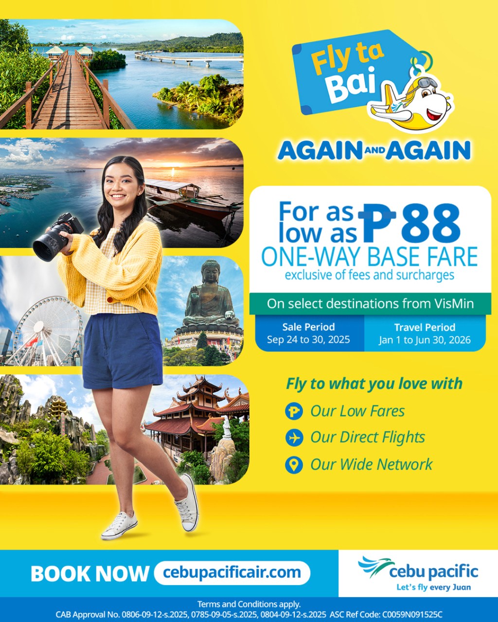 From September 24 to 30, 2025, travelers can book their flights from select destinations in Visayas and Mindanao for as low as PHP 88 one-way base fare, exclusive of fees and surcharges. The travel period will be from January 1 to June 30, 2026, perfect for those who want to plan their summer travels early.