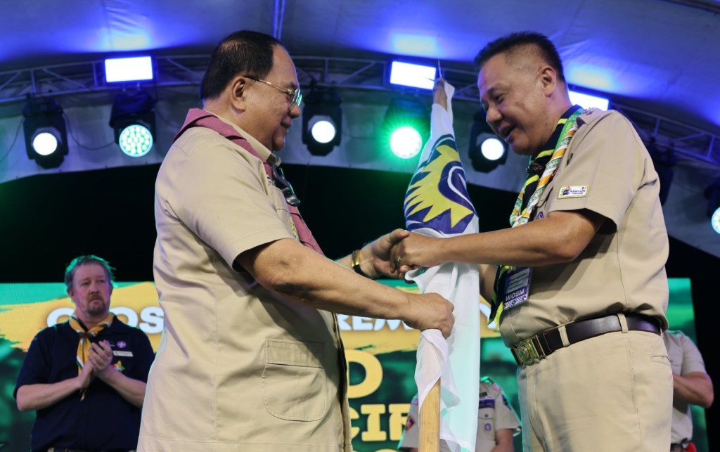 📸33rd APRSJ Camp Chief Gov. Hermogenes Ebdane Jr. (left) turns over the APRSJ flag to a representative of Thailand, the host of the next Asia-Pacific Jamboree in 2029.