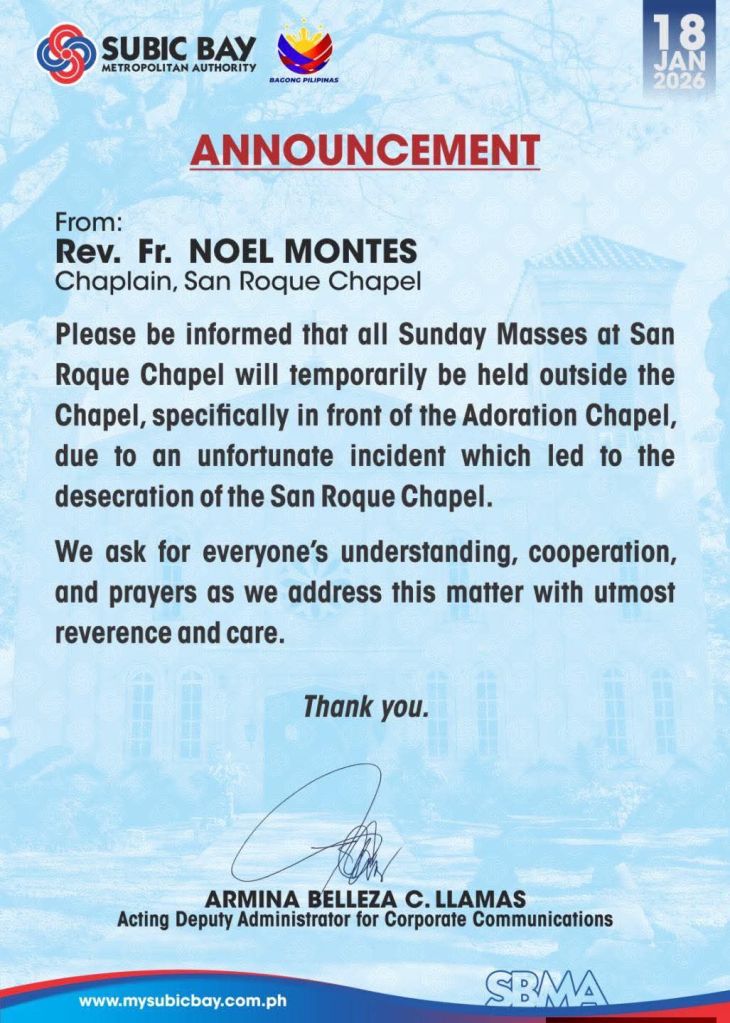 SUBIC BAY FREEPORT ZONE — Pansamantalang ililipat sa labas ng San Roque Chapel ang Sunday Masses matapos ang isang hindi kanais-nais na insidente na humantong sa paglapastangan sa naturang kapilya.