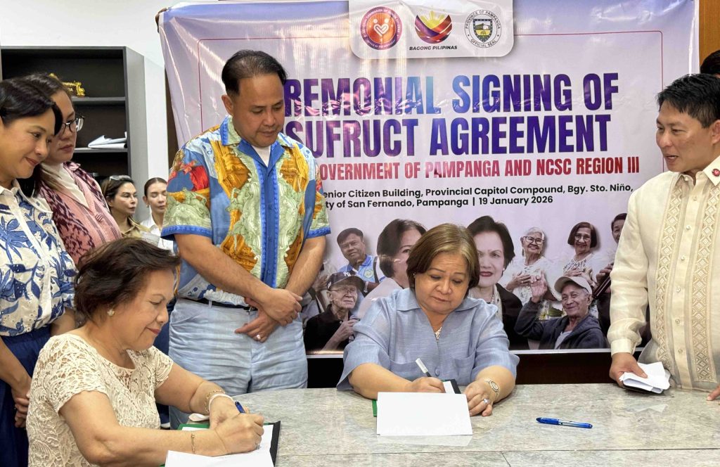 TOP 📸:The National Commission of Senior Citizens, represented by Chairperson Merceditas Gutierrez (seated, left), and the Provincial Government of Pampanga, represented by Governor Lilia Pineda (seated, middle), sign a usufruct agreement for the establishment of a regional office inside the Capitol Compound. This aims to strengthen the regional presence of the commission for more efficient and faster delivery of programs and services for older persons in Central Luzon. (Aldrin Joshua P. Mallari/PIA 3)
