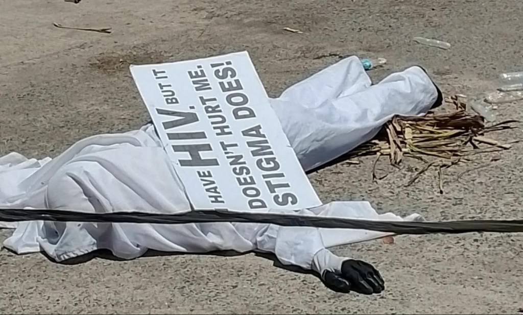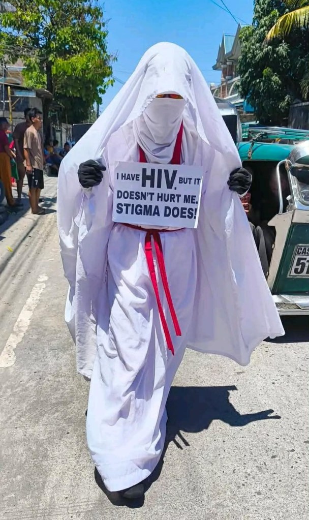 Ayon sa mga nakasaksi, ang naturang indibidwal—na hindi matukoy kung lalaki o babae—ay balot ng puting kasuotan na kahalintulad ng sa madre. Mayroon din itong nakasabit na placard sa harap at likod na may nakasulat na: “I have HIV but it doesn’t hurt me, stigma does.”