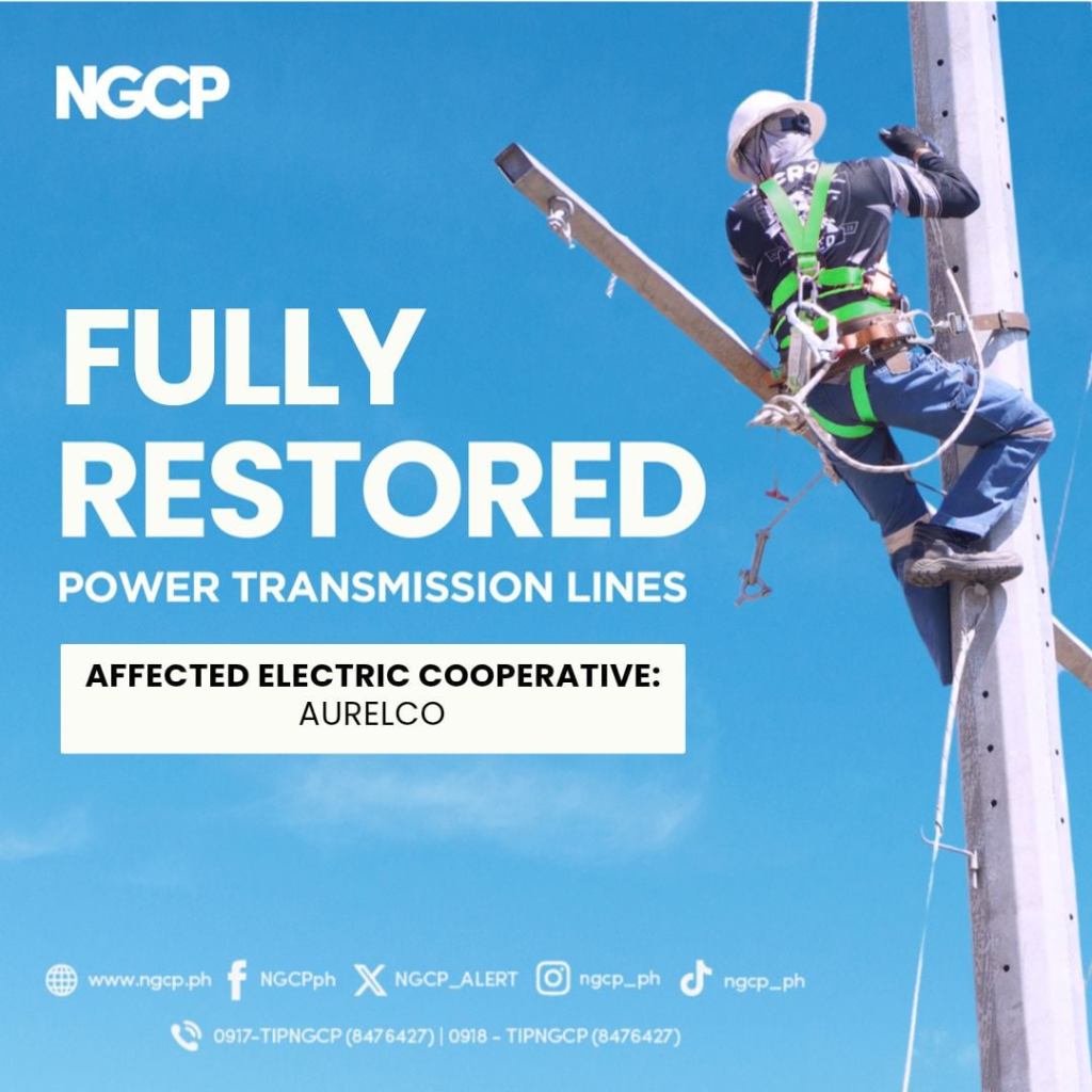BALER, Aurora — Full power transmission services were restored in parts of Aurora Province at 11:55 AM today (Good Friday), April 3, 2026, following an unexpected tripping incident along the Cabanatuan–San Luis 69kV line on the evening of April 2, 2026.