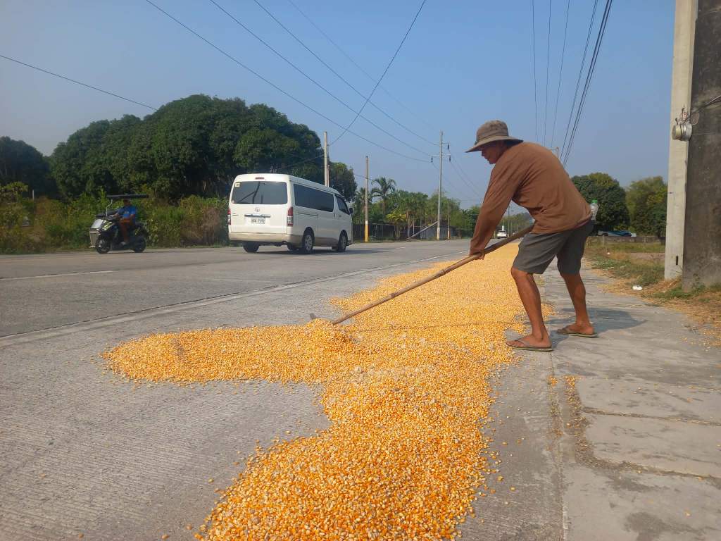 Lito Figueres spreads corn bits used for animal feed along the Olongapo–Bugallon Highway in Sitio Linoron, San Marcelino, Zambales to dry under the sun. The 61-year-old farmer, who has worked in agriculture since childhood, said he is unaware of the Regional Tripartite Wages and Productivity Board–Region III (RTWPB-3) announcement on the implementation of the second tranche of Wage Order No. RBIII-26, which provides higher daily wages for agricultural workers in the region. (Ang Pahayagan photo / JUN DUMAGUING)